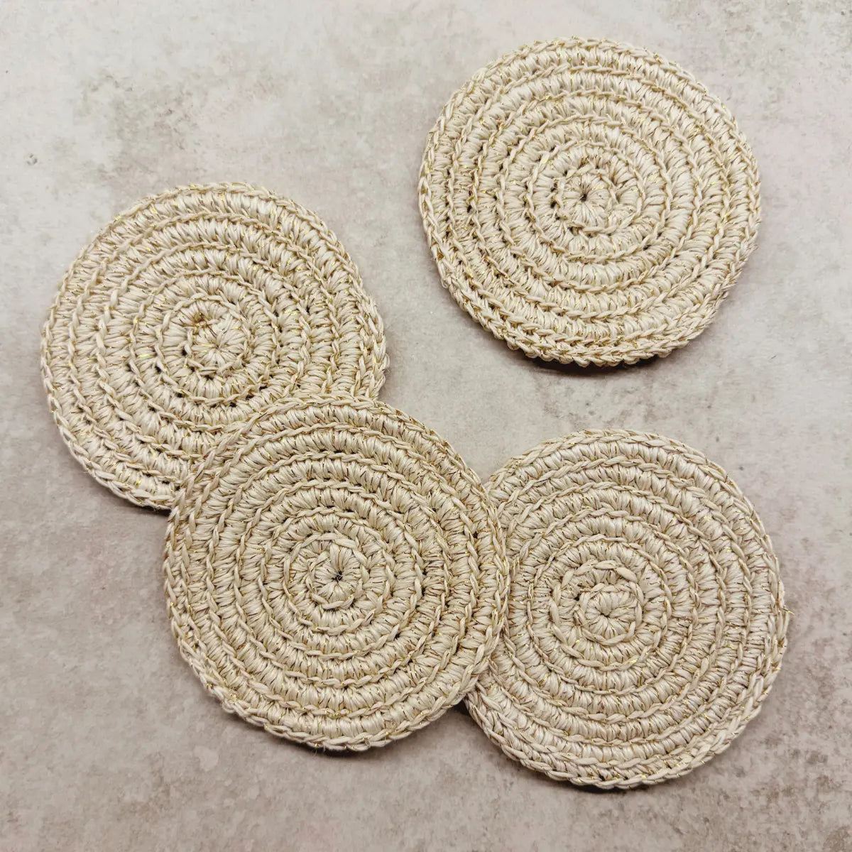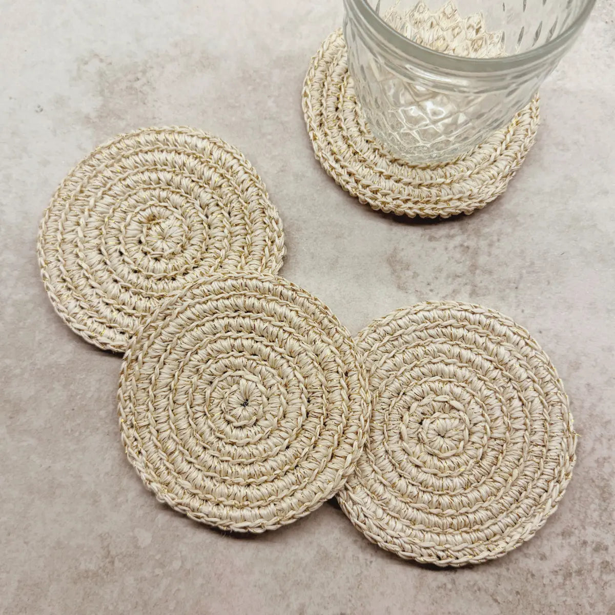 Portavaso redondo tejido por artesanos del nororiente colombiano con detalles en hilos dorados, perfecto para acompañar y decorar tu mesa de manera natural con armonía.